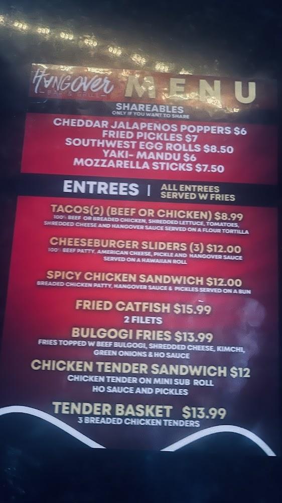 The menu at Hangover Bar & Grill features a mix of comfort food and shared plates. Dishes like the Hangover Burger and Bulgogi Tacos highlight unique flavor combinations. Most plates average around $11, making it affordable for almost anyone. Their Suicide Nachos and Buffalo Chicken Salad are perfect for sharing.